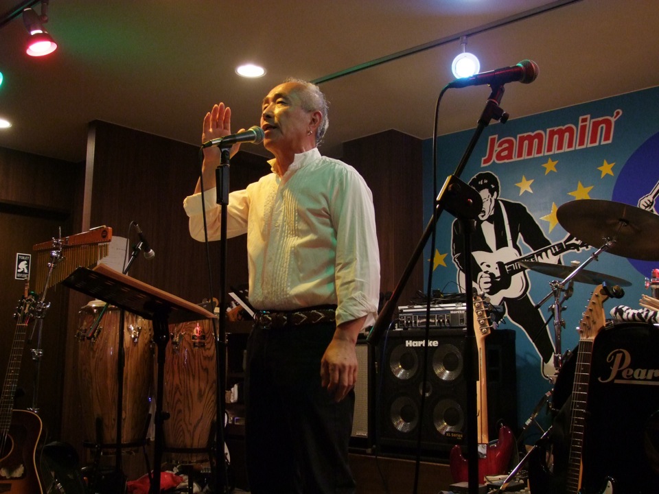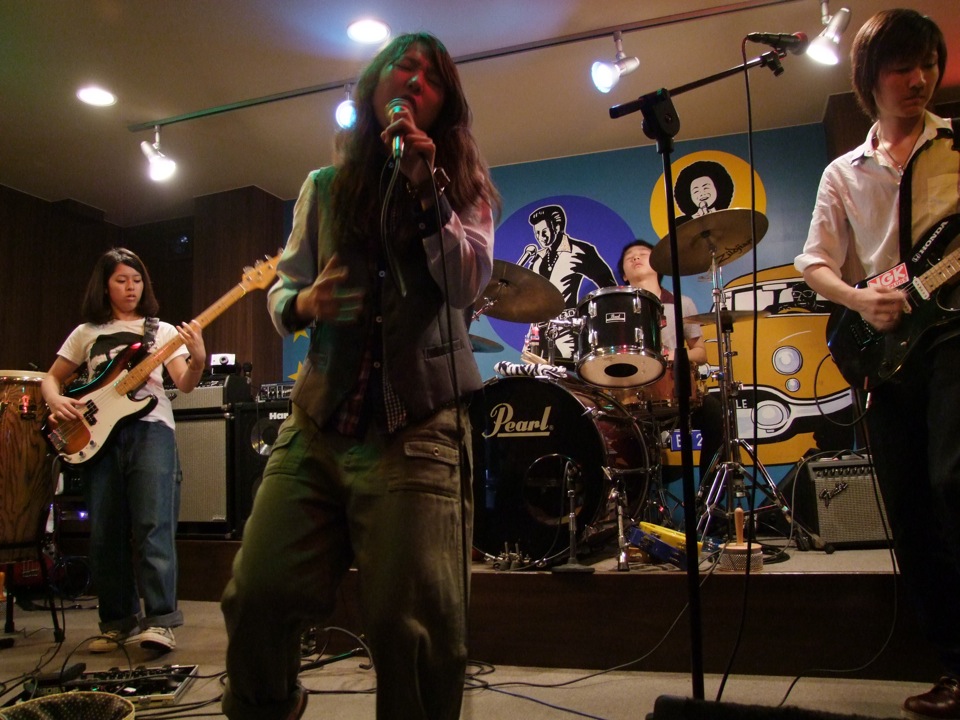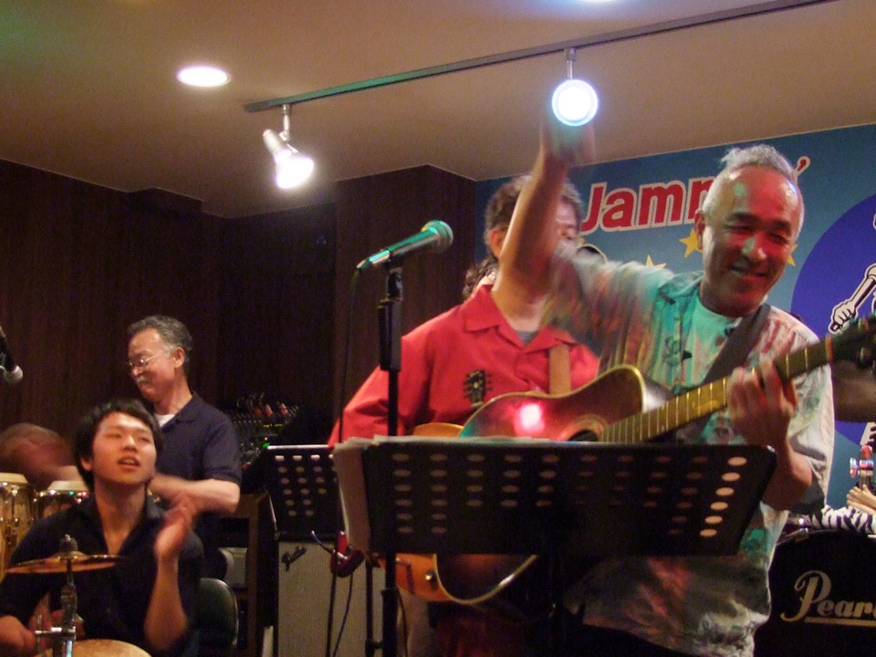 そして、このステージのハイライトは、ミキヤが参加しているという、高校生によるバンドの演奏です。…とは言え2曲だけの演奏でしたが(笑)、ミスター・ビックの曲を取り上げる等、インパクト的に強烈なものを残してくれました。高校2年生のミキヤがドラムを務め、後の3人は高校3年生という布陣も大したものです。高校生らしい勢いのある演奏と、とにかく音楽が好きであるという思いは、誰にも負けてない感じがしたものです。ビートにも重みがあって、いい感じだったと思います。このボーカルの子と UNIT メンバーでも“Little Wing”というカバー曲を1曲やりまして、それも盛り上がった時間でした。なかなか良い感じでライブが進んでいっているではないですか♪