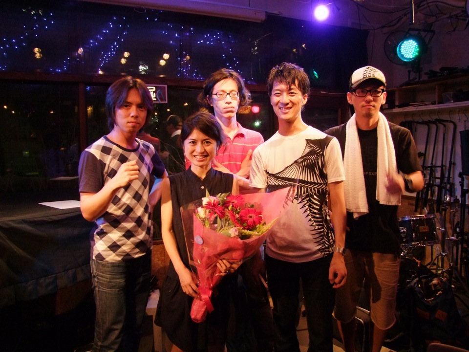 …そして、その拍手が鳴り止む事はありませんでした。このままアンコールへと繋がらせていきますが、今回、既にアンコール曲は思案済みでした。それは、郷原君も交え、そしてミエさんも交え、計5人で、自分がアレンジした“Spain”を演奏する事でした(欲を言えば、Deep River のベーシストである田中啓介さんも交えたかったのですが、ベースが2本は物理的に難しかったので断念しました)。この5人もなかなか珍しいですが、曲のアレンジも更に5人用に…と言いますか、それぞれにメロディの割り振りやソロの割り振り等を決めておき、正にこの日でしか見られないジョイント演奏にしておいたのです。