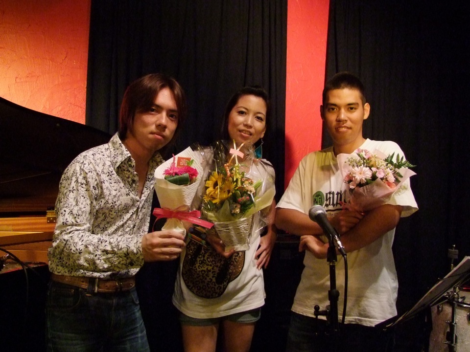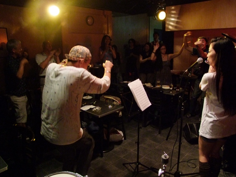 そして、ある意味で特筆的な出来事というのが、この2ステージ目に凝縮されていたような気がしました。沖縄民謡である“てぃんさぐぬ花”演奏時に、お客さんで西仲さんの知り合いの沖縄出身の方がいて、急遽歌うように促したり、その後西仲さん自身も歌い出したり(珍しい…)、別の曲で、フルートを持って遊びに来ていたお客さんとセッションをしてみたり、また別の曲で(“谷茶前”だったと思います)、自然発生的にお客さん側から手拍子が始まり、そのノリがいつしか、会場全体で立って踊り出す(エイサー的な…)ような雰囲気になっていったり…。前回の沖縄ツアー〔西仲美咲、沖縄ツアー(2011.414~4.16) 参照〕の一幕を見ているようでもありました(笑)。しかし、ここは東京の三軒茶屋という場所で、しかもジャズを基本的に演奏するというライブハウスの中なのです。なかなかこんな絵は見られないでしょう。これが沖縄パワーなのではないでしょうか。