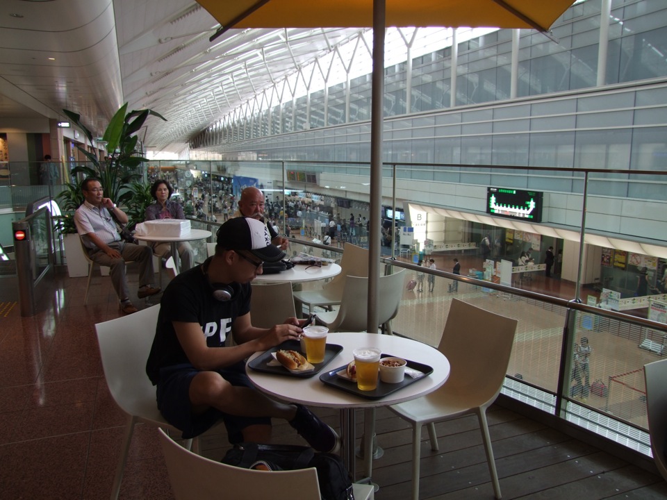 ウッドベースを預けるのは、少々手間が掛かっていたので(別の階まで、ベースを運びに行かなくてはならないのです)、自分とトシさんは早速1杯やりに行きました(笑)。まだ午前中という時間帯ではありましたが、その状況が逆にモチベーションが上がります。池田君とは結局、飛行機搭乗ゲートの前で落ち合う…という策を取りましたが、何のトラブルも無く、時間通りに飛行機は出発していきました。