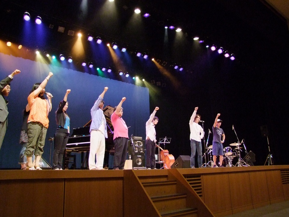 …と言うのは、この“New どさコン”の主旨として、東京から若いバンドを呼んで、その代わり伊達の街のPRをさせる役目を遣わせ、伊達も東京も元気になっていこう!…みたいな主旨?があって、その合言葉として「さあ、元気出して行くべさ!」と言うと「オー!」…という掛け合いの儀式?が存在するのです。その第一声が自分に任されているので、ここは責任重大です…。そのポーズも指定されていて、左手をグーにして腰にやり、そして右手もグーにして、天高く突き上げるような感じです。…という事で、初めてだったので、ぎこちない感じだったのは置いておくとして(笑)、何とか大役を務める事が出来ました。さあ、演奏にいきましょう…。