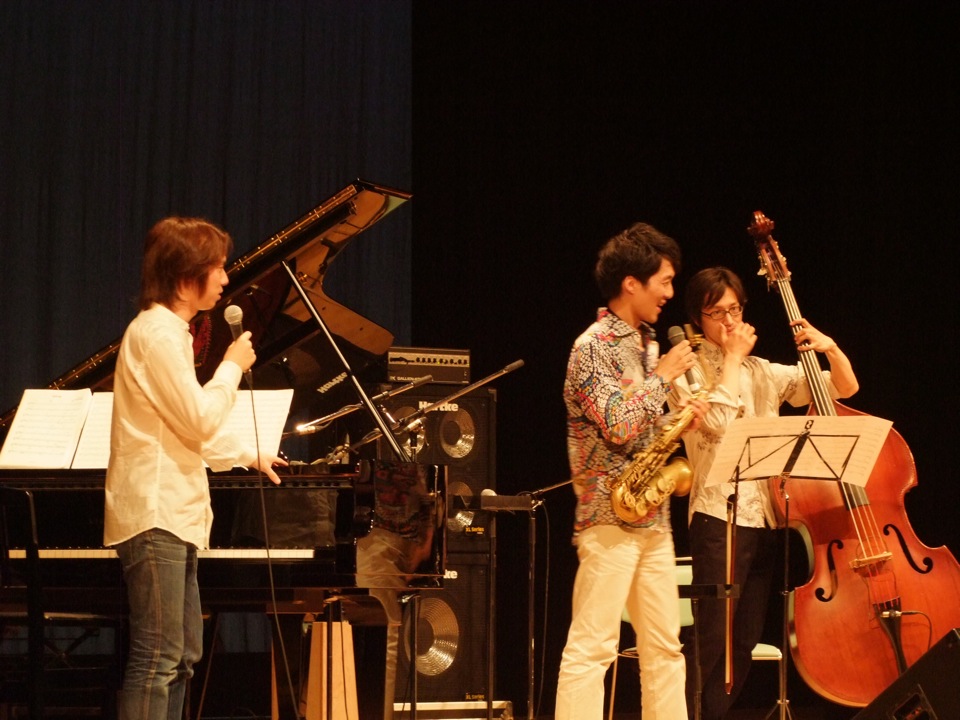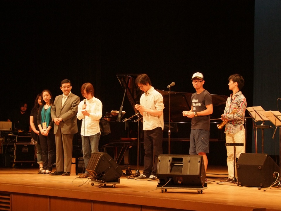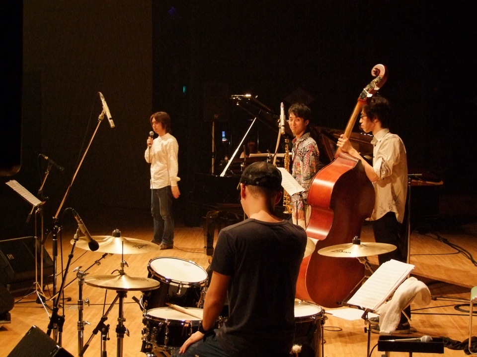 先に、昨日一緒に食事会をした方々、つまりは協会の方々からの挨拶が始まりました。司会の成田さんの進行でスムーズに進み、そして自分のピアノトリオが紹介されます。そもそもホールという場所で自分のバンドがライブをやるのは初めてだったので、随分と新鮮な状況に心躍りますが(笑)、自分には、掛け声を掛ける…という役を任されています。