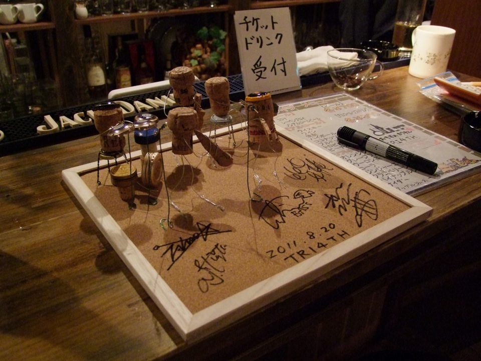 その中でも、お店のマスターの上の写真の作品には驚かされました。コルク・アート…とでも言うのでしょうか…。よく見ると、自分達のライブ時の模様が表現されているのです。つまりは自分達の演奏中に、仕事の合間を縫って制作していたわけで、しかもライブ終了までに完成しているというのが驚きです。基本的にはワインのコルクと針金だけで作られているのですが、人の体格に合わせて(織田君とか…笑)コルクを選んだり、ドラムセットの配置を、ちゃんと実際のステージ上と同じにしたりと、細かい拘りが随所に見られるのです。そこに自分達のサインを書いて完成…という事で、これは今後お店に飾って頂ける事になるそうです。マスター曰く、本当はこれと同じ物をもう1つ作って、1つはミュージシャン方にプレゼントしたい…との事だったのですが、流石にそれは時間が足りないのだそうで、いやいや…、その気持ちだけでもう自分達は満足です!