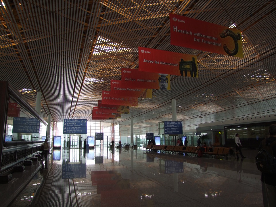 着陸の直前になって、ようやく地面が見えてきたと思ったのも束の間、そのまま飛行機は北京首都国際空港に到着しました。周囲は右上写真のように茶色くガスっていて、これぞ中国っぽい風景…とも思ってしまいますが、出来れば晴れの景色も見たいものです。広大な空港では、それこそ移動には時間が掛かり、飛行機が到着して降機し、入国手続きや荷物受取やら色々あって、市内に向かうバスに乗れたのは、到着1時間後という感じでした。まあ、これは前回で既に予測済みの事でもありますが…(笑)。