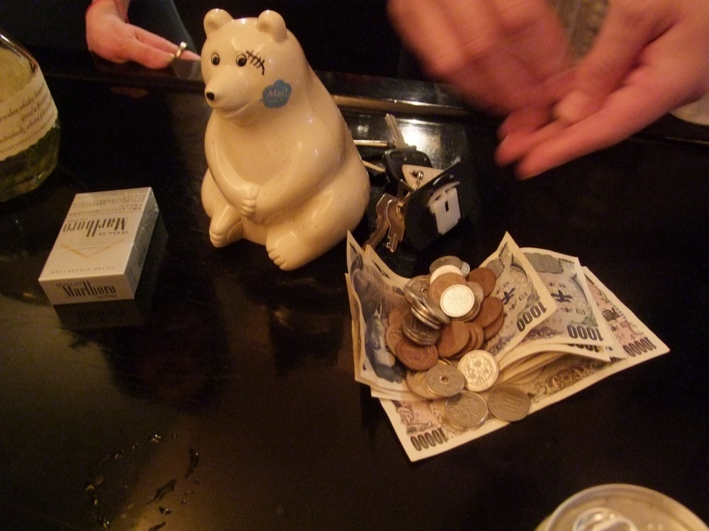そしてこの日は、かわ島さんへの義援金の解禁日でもありました(笑)。右上写真に写っているのはシロクマ型の貯金箱でありまして、昨年の誕生日に頂いたものだそうですが、お店に常に置いているものであり、お客さんからの義援金(まあ、所謂チップというものですが…笑)が貯まりに貯まって1年が経ち、ついにその封印を解かれたわけなのです。