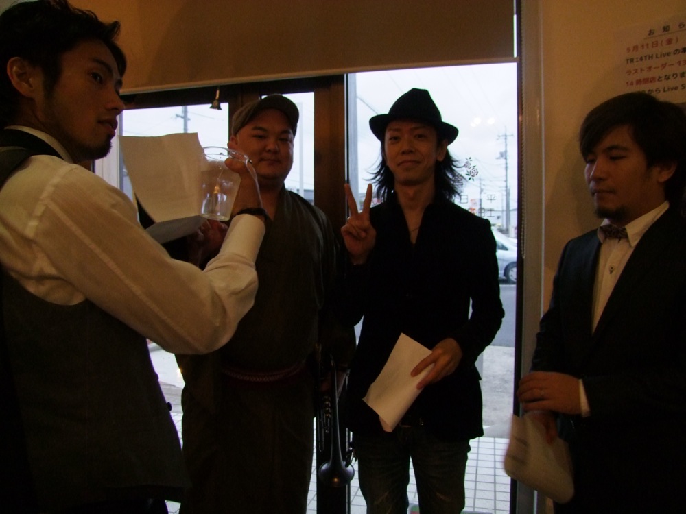 目新しかったのは、織田君がこの日、この鳥取にくる車中で作ったという、言わば新曲を披露した事でしょう…。本当に、先程出来上がったばかりのホヤホヤの曲で、この倉吉という土地をイメージして作ったとの事でしたが、自分達としても初見に近い状態で演奏したので、とにかく譜面と、そこから湧き上がる音を素直に受け取り、そのまま音にしていったという感じでした。タイトルにしても、仮のままなので、この先どのような展開が待っているかは全く分からないのですが(笑)、演奏してて、非常に新鮮な時間だったと思います。TRI4TH はどちらかと言うとリハーサル(当日ではなく、事前のスタジオにて)を入念にしていくバンドで、今回のような状況で新曲を披露するという機会は殆ど無く、それが新鮮さに繋がっていったのだと思いますが、個人的にはとても楽しい時間でした。皆、曲を完成させようと、必死と言えば必死の状況でもあるのですが(笑)、そのスリル感がまた良かったような(そして、曲調がそんなにスリル感が無いのが、また良かったのです…笑)…。ある意味で、一番ジャズらしかった時間だったかもしれませんね。