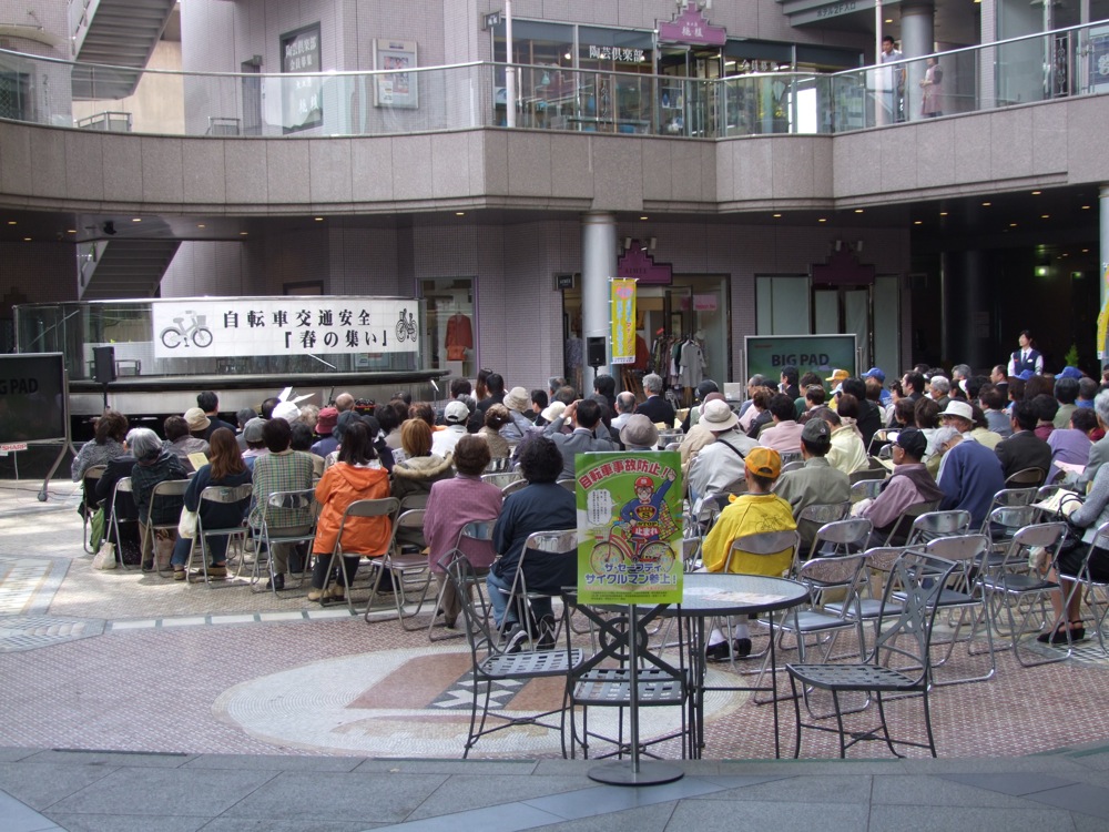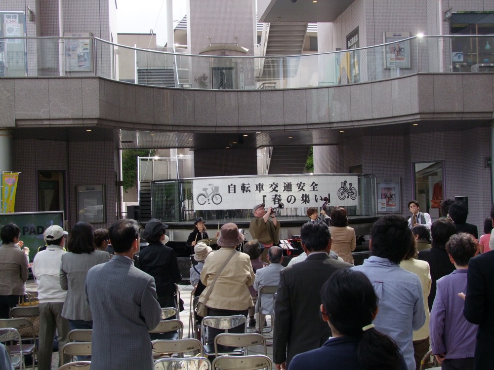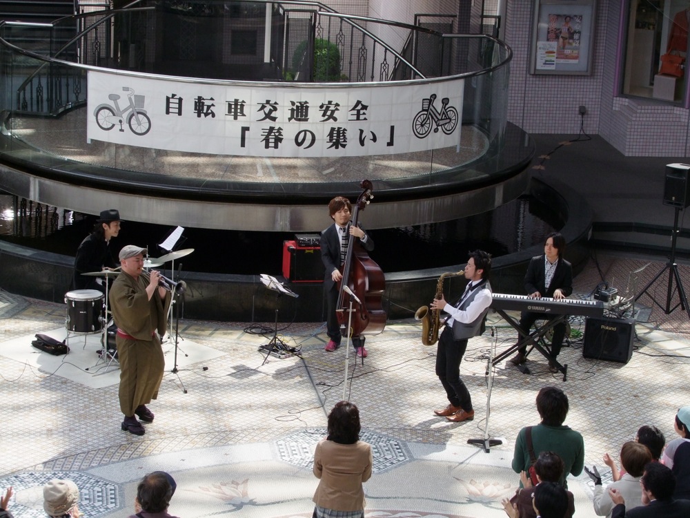 今回この場所では、堺警察署による自転車交通安全「春の集い」というイベントに、TRI4TH がゲストとして出演する…という事になっています。イベントは13:00から始まり、会場の広場には椅子を敷き詰め、安全指導等を行っていき、途中では“ザ・セーフティー・サイクルマン”という謎のキャラクターも登場(かなりガタイが良い…笑)したりして、なかなか皆さん楽しんでおられる様子です(笑)。そして、意を決して?自分達の登場。『わらべ JAZZ』を中心に、野外という環境を生かして、伸び伸びと演奏させて頂きました!