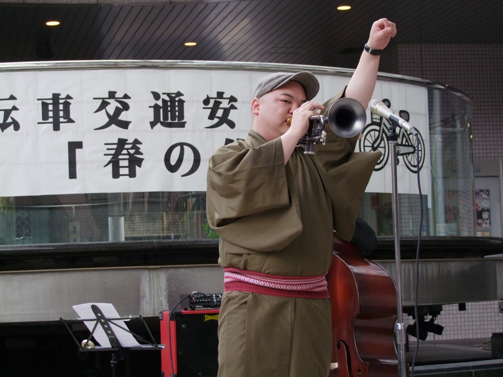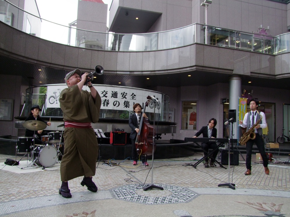 警察のイベントという事で、“犬のおまわりさん”は欠かせません(笑)。やはり自分達の特徴を端的に表す時に、『わらべ JAZZ』は本当にやりやすいですね。ジャズという、言わば特徴的な演奏に、個々のアレンジを施している部分を如実に見せる事が出来るのです。そして、元の曲はと言えば、誰でも知っている“童謡”なのですから、気にならないわけがありません。今回は子供達も多く見てくれていましたが、やはりお客さんの中心は御高齢の方々…という感じで、そこは逆に“童謡”からのジャズ…という話しがしやすかった環境のようにも思いました。そんな方々を踏まえてか、事前に、舟木一夫の“高校3年生”のリクエストがありまして(笑)、この曲の演奏をジャズらしくお届けしたもの、この日の特徴だったように思いました。