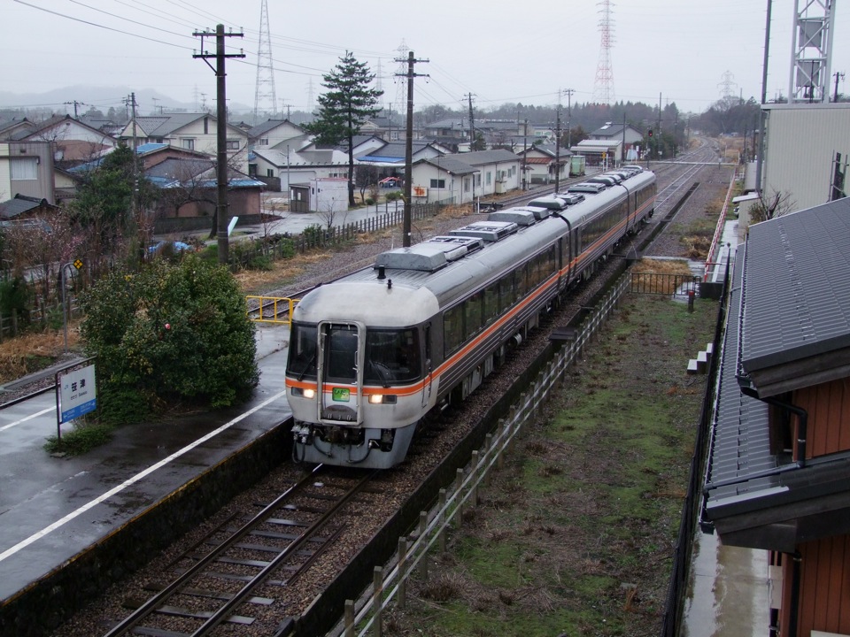 特急『(ワイドビュー)ひだ』号が通過して暫くして、2両編成の猪谷駅行きの列車がやってきました。笹津駅は、駅舎自体は新しそうでしたが無人駅で、駅周辺は大変静かなところだったと思います。ここは富山平野の南端ぐらいの場所に辺り、高山本線はここから更に、南の方向を目指して進んでいくのですが、早速山が近くまで迫ってくるようになり、いわゆる山岳路線へと変化を遂げていくわけです。