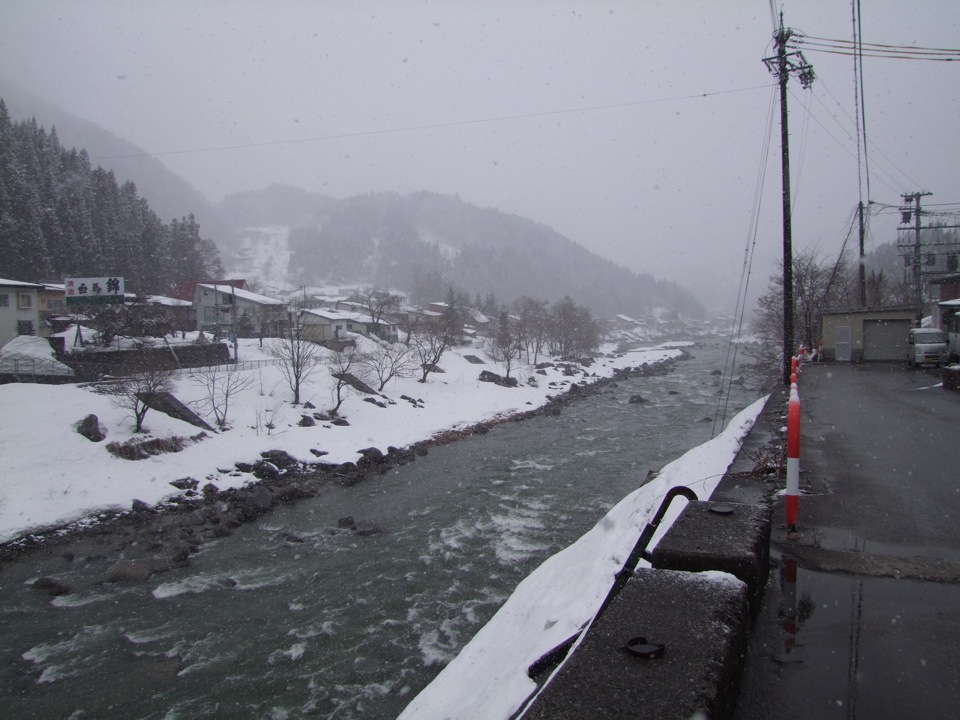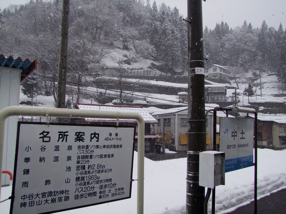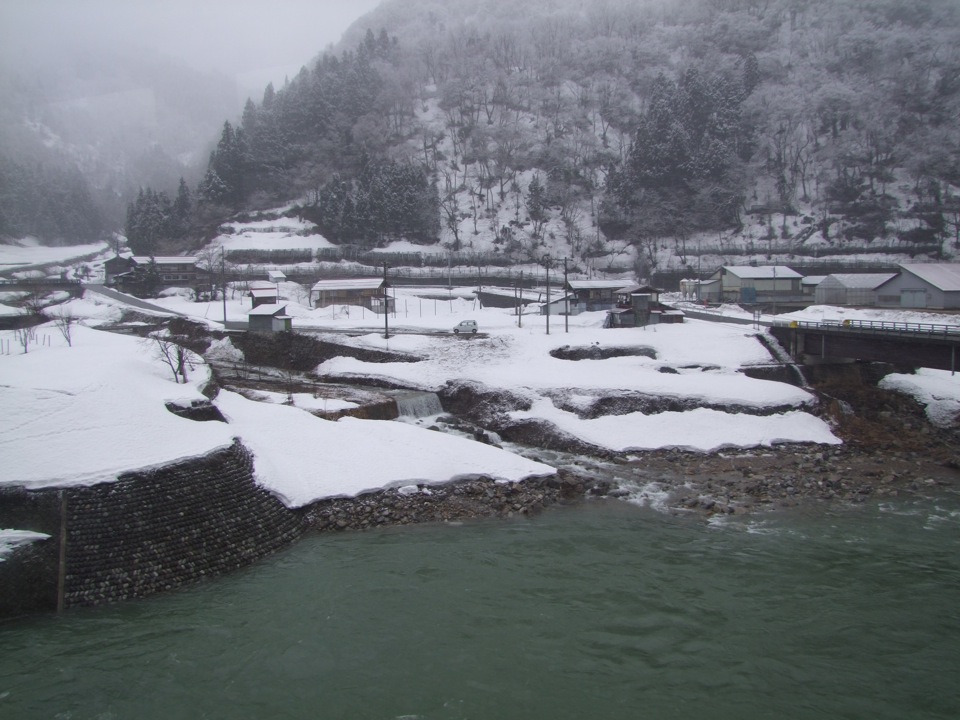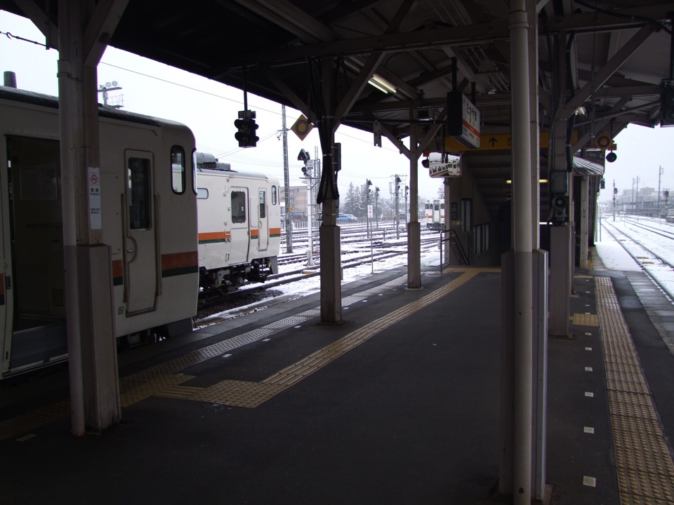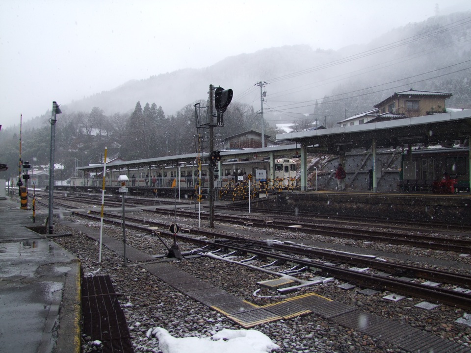 猪谷という駅は笹津駅から2つ目の駅で、ここでJR西日本からJR東海の路線となり、運行上の分岐駅でもあるので、特急列車以外では。ここで乗り換えが必然となります。自分が乗ってきた列車も例外では無く、車両もJR東海のものになり、更に山を越えていきます。この駅の時点で、さっきまで降っていた雨は雪へと変わり、山々にも残雪が見られるようになりましたが、まだまだ雪の景色はこれからなのです。