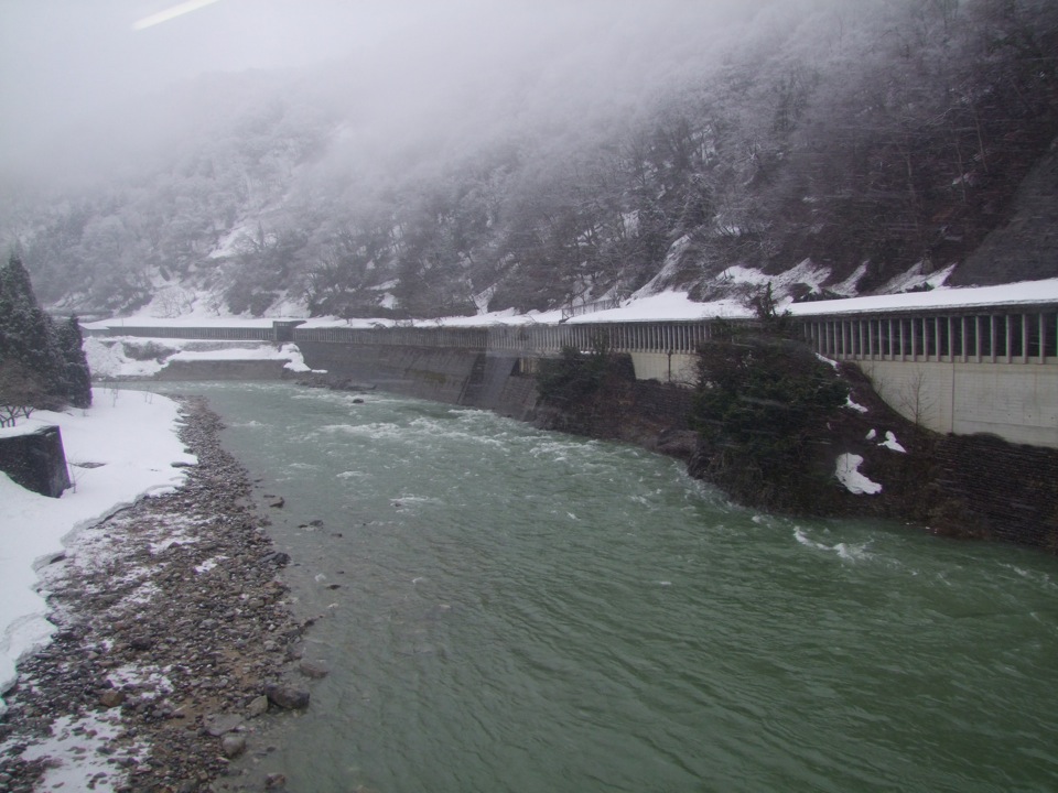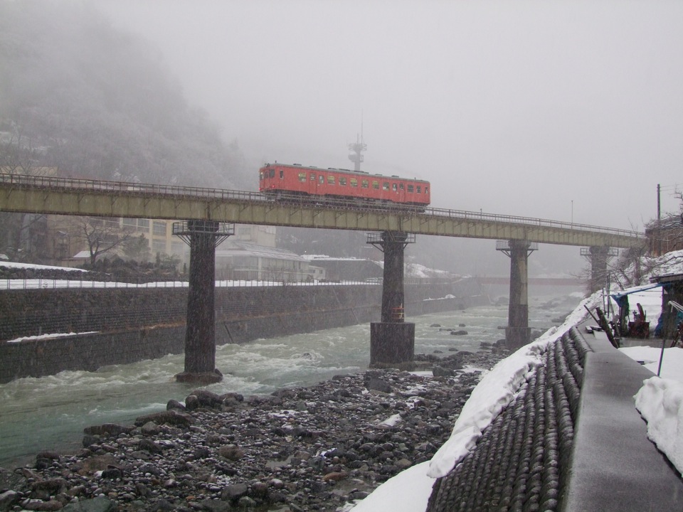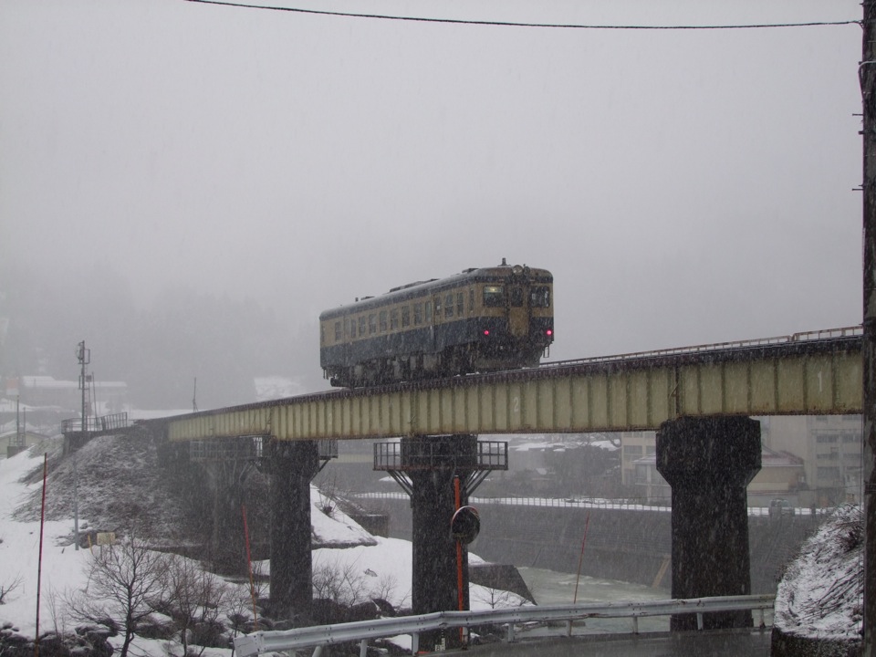 糸魚川駅を出て、姫川という川に沿って南にずっと下っていきます。この姫川…、名前からは想像出来ない程の暴れ川として有名で、1995年にはこの大糸線も土砂災害の犠牲となってしまい(橋脚が流されたのです)、長い間運行できない時期が続いていた事もありました。それは糸魚川駅を出て1つか2つ目の駅で、すぐに雰囲気的に分かる筈です。急激に山肌が迫り、もはや渓谷に近い感じで列車は進んでいくのです…。また、雪もいきなり深くなり、先程のJR高山本線より急に、険しい道のりに突入…という感じでもあります。