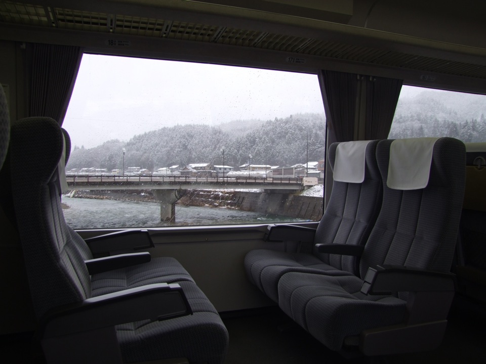 昨年、高山に来た時にも乗ってきたこの特急ですが、列車名に“ワイドビュー”と冠しているだけあって、窓からの眺めは抜群で、座席が通路より1段高く設定されていて、そして窓自体も大きいサイズになっています。もちろんスピードも速いのですが、それは高山より南の区間の話しであって、高山駅~富山駅間の区間は、利用者も少なく本数も少ないので、そんなに線路設備にも手に入れいている感じではなさそうでした。実際、名古屋駅から来た特急は、日曜日という事もあり9両編成でやってきたのですが、ここ高山駅で6両を切り離し、終点の富山駅までは残りの3両という陣容でした…。利用者の少なさが窺えるというものです。