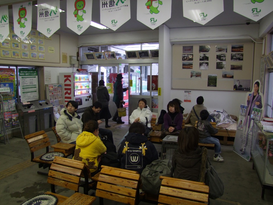 さて、ここでのメインは“撮影”です。雪の中を走るキハ52形は、また勇ましくも見える事でしょう。ギリギリ今乗ってきた車両も写真に収める事ができ(右上写真参照…駅に到着してから発車するまでが、割りとゆっくりしていたのが幸いでした)、後は折り返し列車を待つだけでしたが、この辺りから本格的に雪が激しく降ってきてしまい、外での待機は危険と判断しました。結局、平岩駅の駅待合室で時間を潰していましたが、他にも何人か同じ境遇の人がいた様子で、やはり皆、大糸線のキハ52形を捉えるのに必死なのですね…(笑)。
