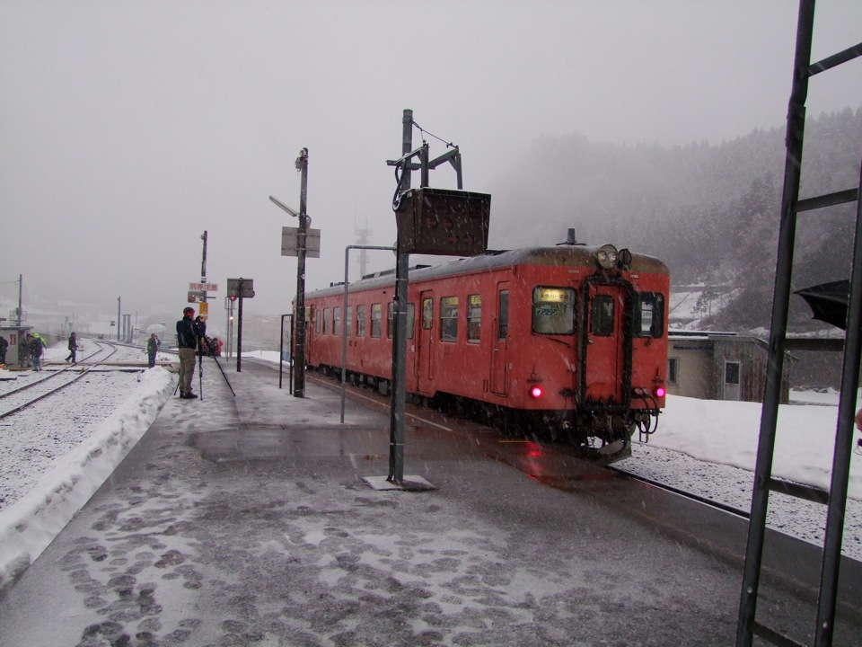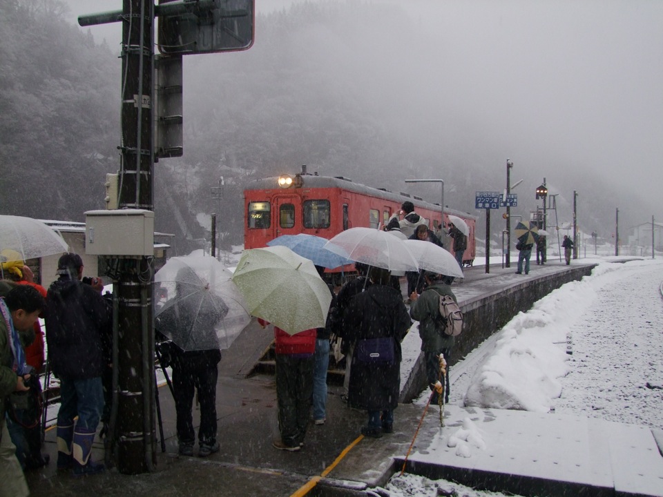 やがて、糸魚川駅からの折り返し列車が到着。姫川を渡る橋脚付近に移動していた自分も無事に撮影を終え、そのまま平岩駅に戻りましたが、当駅は、今その列車に乗ってきた乗客と、先程の自分と同じ境遇の人を合わせ、急に賑やかになっていました。駅から、特にお客さんが降りていった形跡も無かったので、これは明らかにキハ52形に乗る為だけに、ここに来た人達です。雪の降る中でしたが皆、ぽつんと佇むキハ52形にカメラを向けては、さながら人気者の撮影会みたいになってましたね(笑)。…まあ、自分もその1人であるのは確かでしたが、こういった雰囲気で、ゆっくりとキハ52形を撮れる機会も少ない筈なので、自分が思った以上に皆、敢えて狙って来ていたのかもしれません。この時のキハ52形は、首都圏塗装と言われる朱色塗装の車両で、また暖かみのある光景が展開されていたとも思いました。