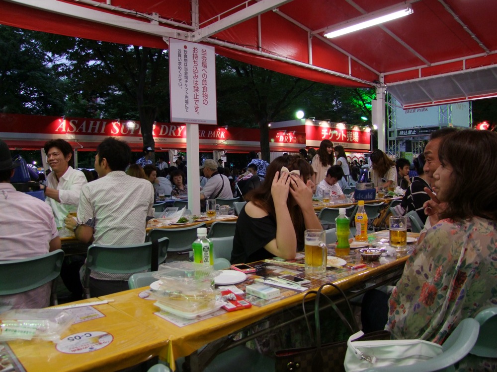 会場内の注文はチケット制となっていて、それを持って席に着き、そしてスタッフにチケットを渡すと、その品物を持って来てくれるシステムのようでした。まあ、最初はこの制度がよく分からなく、様子を見ながら過ごしたものでしたが(笑)、すぐに慣れました。このサントリーのブースでは、ビールの他にもハイボール等を推薦していましたが、やはりこの状況での生ビールに勝てるものはありません(笑)。サントリーの代表格、ザ・プレミアム・モルツで、最初の乾杯がいざ始まりました♪