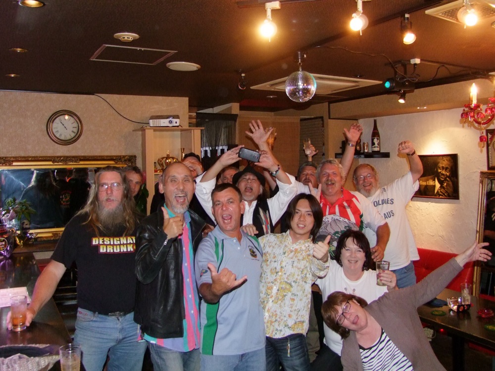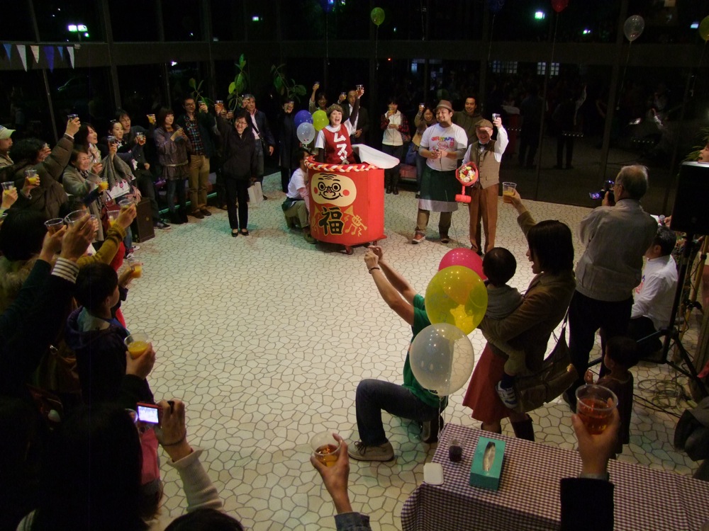この後はお酒が振る舞われたり、お祝いの樽をオリパパが割ると、中から娘が出てくるという段取りが仕込まれていたり(笑)、オリパパの顔を模ったケーキが出されたり、皆で記念写真を撮ったりと、もう盛り沢山!…オリパパが笑顔になれば、皆が笑顔になる…というように、本当に楽しい会になったと思いました。TRI4TH のメンバーも勿論全員で参加。CDの販売を行いつつも(笑)、楽しいひと時を皆さんと過ごさせて頂きました♪