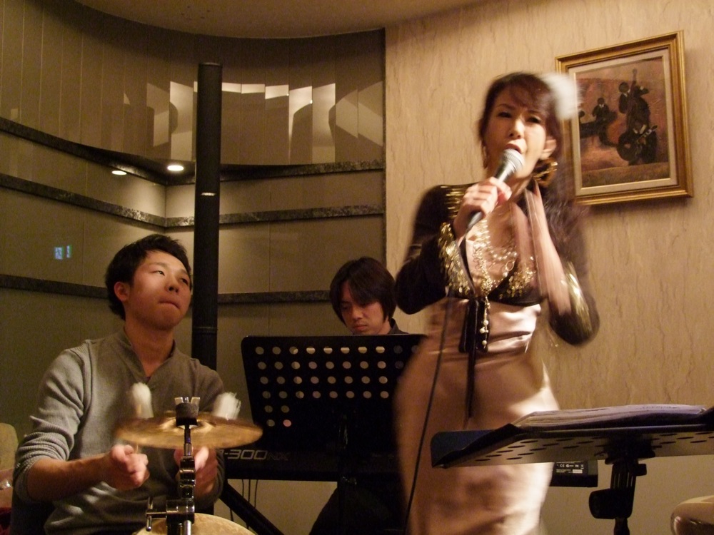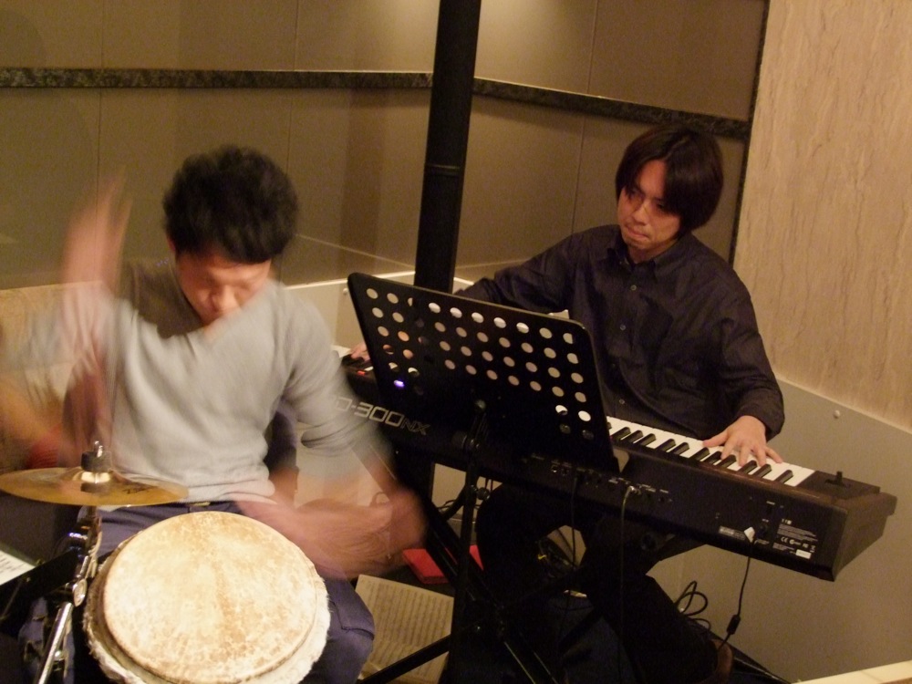 演奏ですが、基本的にはインスト曲を自分とミキヤで担当し、恭子さんが歌う曲では、出来る曲だけミキヤが入る…というスタイルにしていきました。これは、恭子さんが歌う曲でミキヤが知らない曲が沢山あるだろう…という状況を踏まえた上でのスタイルでしたが、実は心配は無用だったのかもしれません…。“ハナミズキ”を知っていたのは勿論の事、“恋人達のクリスマス”も知っていましたし、一緒に演奏はしませんでしたが、“翼の折れたエンジェル”も知っているとの事でした。これなら、すぐにでも歌伴奏の仕事が出来るんじゃないかと思う程でしたが、実際、曲の特徴をよく踏まえた上での演奏を心掛けている感じがしましたし、今後が楽しみなプレイを披露してくれました。インスト曲も、“Caravan”をやったり“Spain”をやったりと、ミキヤには常にその場で曲を与えてのステージを用意してしまいましたが、よく対応してくれたと思います。お陰で、スリル感もありつつ、楽しい時間が過ごせました。どうもお疲れ様でした!