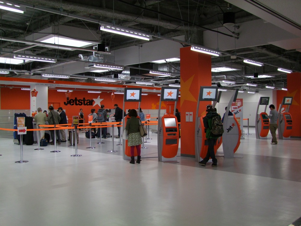 さて、成田空港に着きました。現在、京成本線からの乗客は、空港第2ビル駅でも成田空港駅でも、乗降の際は2度改札を通らなければいけないという変な状況になっていますが、細かい事はさておき(笑)、ジェットスターの搭乗口へと移動しましょう。いつの間にか設置されていたチェックイン・カウンターは、自分は事前にHPでチェックインの手続きを済ませているので通過し、荷物検査を経て搭乗口に向かいます。やはりまだ殺伐としていた成田空港の国内線ロビーでしたが、今後は更に需要が加速しそうなので、ある程度は発展していくと思います。