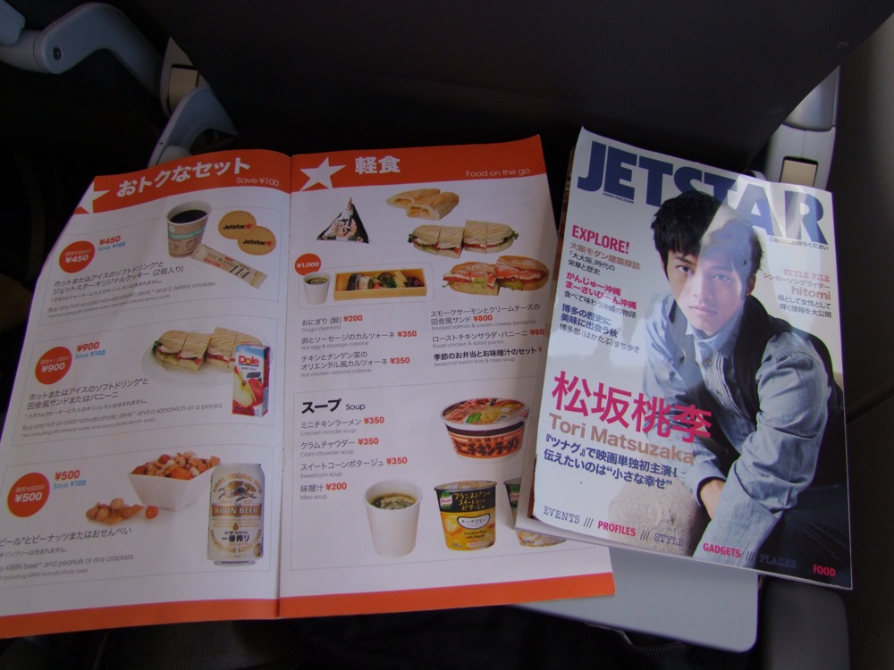 ほぼ時間通りに成田空港を離陸。飛んでしまえば、もう一般の航空会社と変わらない感じではありますが、やはり飲食物は全て有料となっています。…とは言え、ある意味でオリジナリティあるメニューで勝負している感じもあるので、ここは割り切っても良い部分でしょう。福岡空港までのフライトは約2時間程度なので、大した疲れにもなりません。そもそも、飲み物は買って持ちこめば良いという考えもありますしね…。