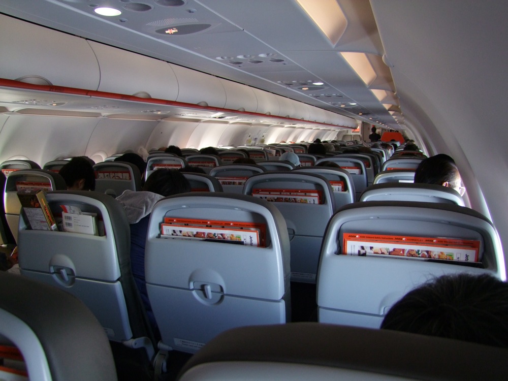 さて、時間になったので飛行機へ向かいましょう…。LCC ではオープン・スポットといって、空港ターミナルから直接乗るのではなく、連絡バスに乗ってタラップで上がるのが、もはや常識です(コスト削減になっています)。機材はエアバスA320-200型で、日本国内線は全てこの機材で統一されています。格安航空会社と銘打っているものの、安っぽいという印象は全く無く、むしろ新しくてエネルギッシュな雰囲気が感じられるような出で立ちではありました。