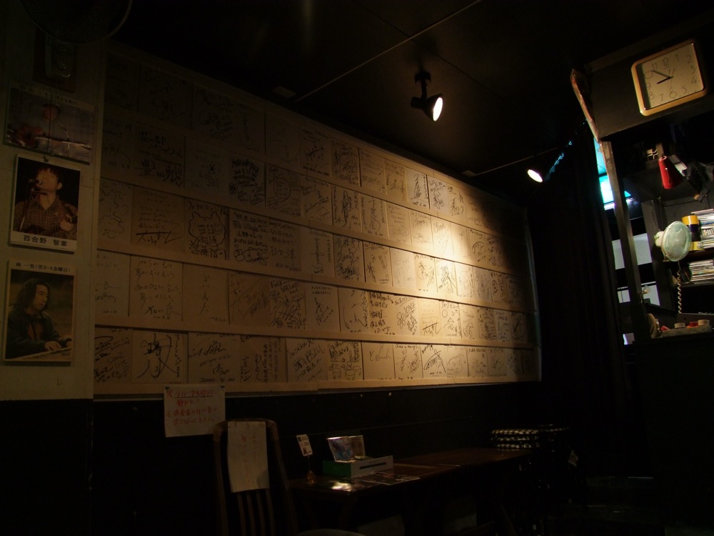 さて、そんなルートで来たとは露知らず(笑)、お店に入り、Daddy さん、ちきぴーさんと合流します。そのまま少しリハーサルを行い、腹ごしらえに出掛けました。その時に、今回はこのように来たという話し(あまり興味無さそうでしたが…笑)や、今回のツアーについて、そして島田さんの事等、色々と話題は出てきたものでしたが、ひとまずはお店に戻り、この日のライブをやらなければいけません。フォークビレッジは開店からもう20年近く経つお店で、名前の通りフォークという分野においては、かなり著名な方々がここで出演をされているとの事でした。確かに、店内飾られているサインを見れば納得です。