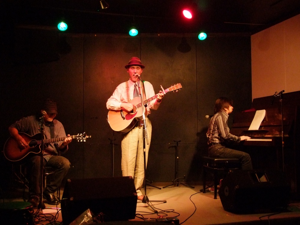 ただ、4日間だからライブは4回…と言うと、そうでもなく、場所によっては、Daddy さんのステージに自分が参加するものと、自分自身のソロとしてのステージを分けて行った所もあったので、個人的なステージ回数としては6,7は回行っていたのでした…。Daddy さんのステージでは、言うまでもなく、ギター・コーラスのちきぴーさんと一緒の参加だったのですが、以前、6月に行われたツアーの時〔Daddy 津田、福岡ツアー(2012.6.21~6.26)参照〕での自分達のメンバーであった、ドラムの島田和夫さんの姿はありませんでした。このブログでもお伝えしましたが〔島田和夫さん…参照〕、昨年の10月2日に亡くなられたからです。あの時 Daddy さんは、自分が現状で呼べる最高のメンバー達…と言ってライブを行っていただけに、10月の訃報は残念でなりませんでしたが、この同じ月での今回のツアー…。また自分達が見せられる最高のライブを行いたいものでした。…そんな状況の中で行われた九州・山口ツアー。どうぞ御覧下さいませ。