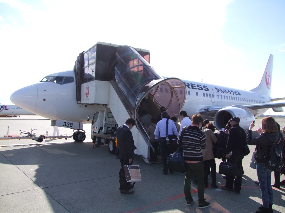 今回の飛行機は日本航空…の連結子会社であるジャル・エクスプレス。羽田~広島線というと幹線のイメージですが、機種は小型機の部類に入るボーイング737-800型がメインとして運航されている路線でもあり、ジャル系列の運航の縮小が垣間見れたというものでした(ちなみに全日空では同区間を、全て中型機以上の大きさの飛行機で運航されています)。羽田空港からの搭乗もタラップによるもので(左上写真参照)、もっと地方の奥に行くような感覚が生まれたものでしたが(笑)、難なく?広島空港には定刻の12:55に到着…。一気に自分は広島県に降り立てる事が出来たのです。