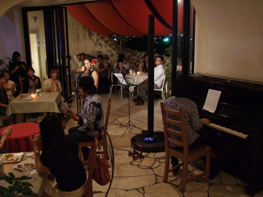 今回は北谷にある複合型ローカルショップ、AKARA とのコラボにより、ライブが実現したと言っても良いでしょう。版画家の名嘉睦稔(以下、ボクネンさん)がプロデュースしたというこの建物は、「Fasion」、「Art」、「Food」のショップをそれぞれのフロアに備え、赤瓦と漆喰が曲線でうねる非常に特徴的な世界観を放つ場所となっています(同じエリアにボクネン美術館も併設)。レストラン Janosz はその「Food」の部分を受け持つ空間で、今回のライブもジャズとビュッフェ…をテーマにお送りしたものでもあったのでした。
