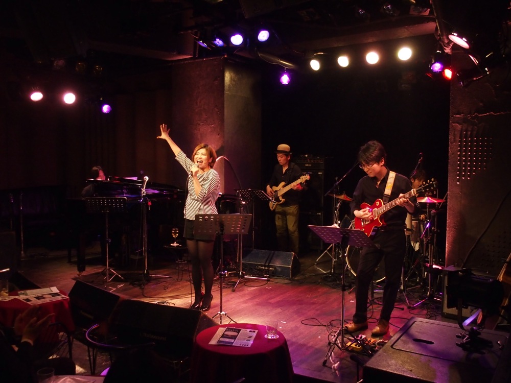…そんな流れもあって、3番目と今回最後の出番だった自分達のステージも、非常に和やかなムードで始まったように思いました。初めは緩い感じから、徐々に勢いを付けていくような流れを盛り込み、3曲目には早速新曲、“恋の Satisfaction”をお送りします。途中にはクラップを入れたりして(左下写真参照)、お客さんにも手伝って頂いたりして、また一段階盛り上がった感じに進めていけたのではないかと思います。
