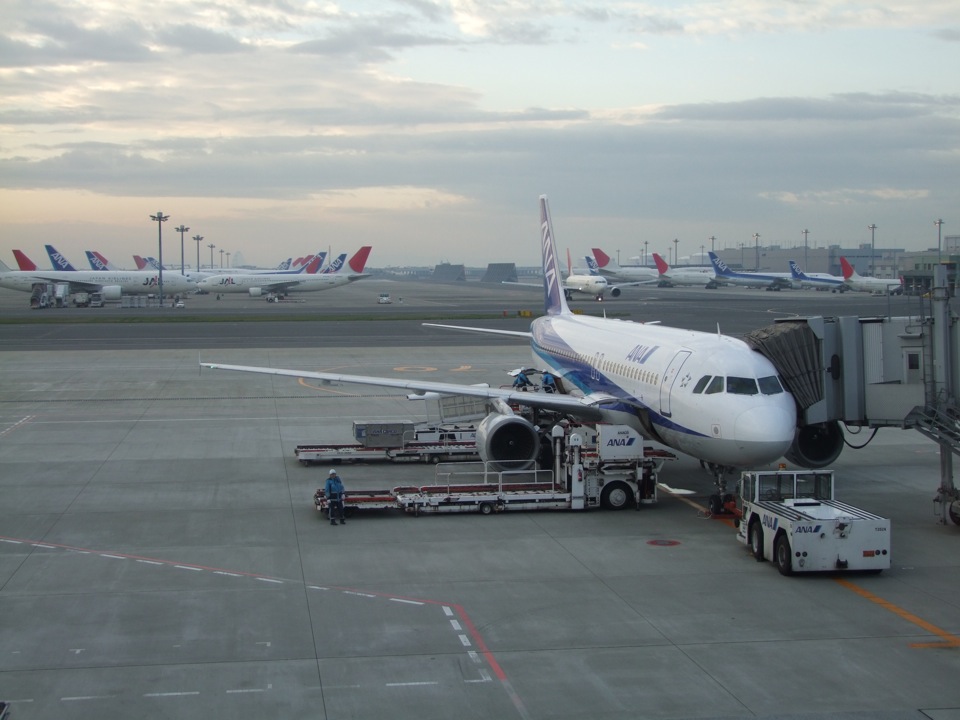 飛行機は全日空のエアバス320-200型で、小型と言える機種ではありますが、それでも機内は空席が目立っている感じでした。かなり朝が早い便なので仕方無いと思いますが、昨今の飛行機不況の影響も強いような気がしました。