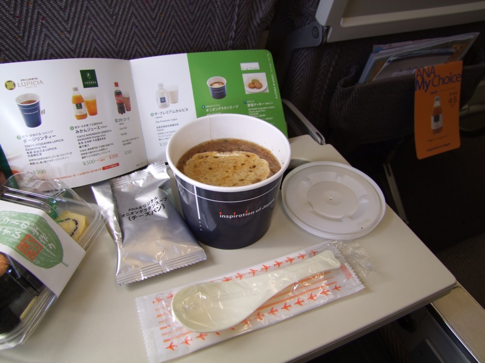 …という事で、ANAオリジナルレシピと題されたメニューから、オニオングラタンスープを自分は注文させて頂きました。有料サービスになったばかりなのか、“キャンペーン価格”という事で、500円⇒300円となっていましたが、何だかんだで現在(6月までは継続決定!)もこのキャンペーンは続いているようです(笑)。