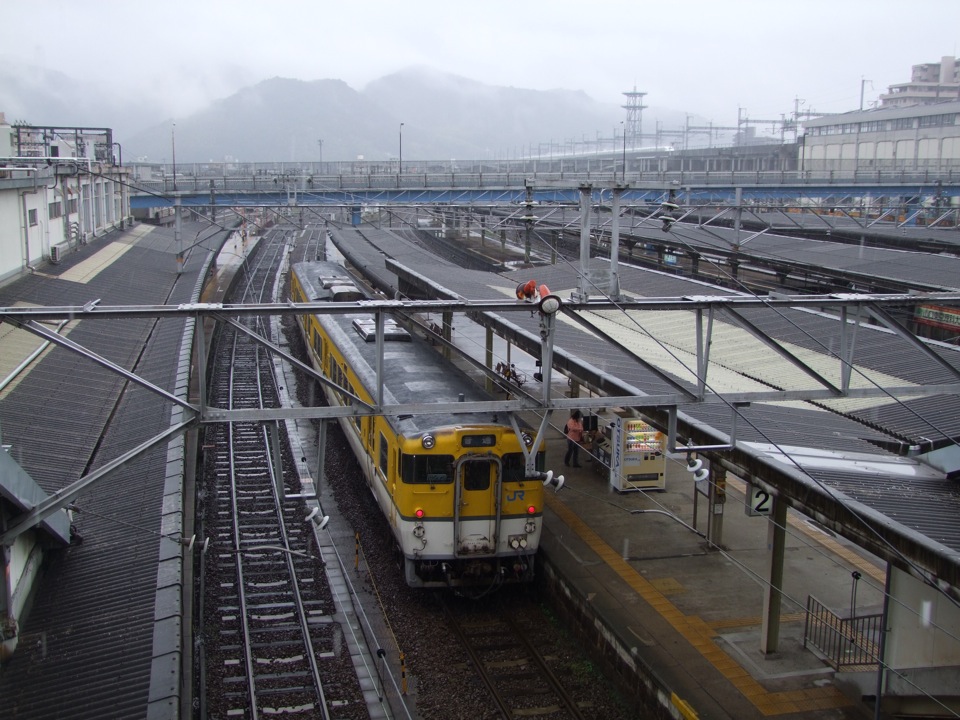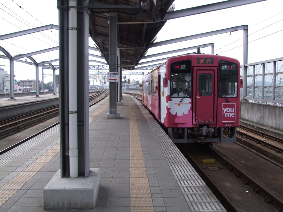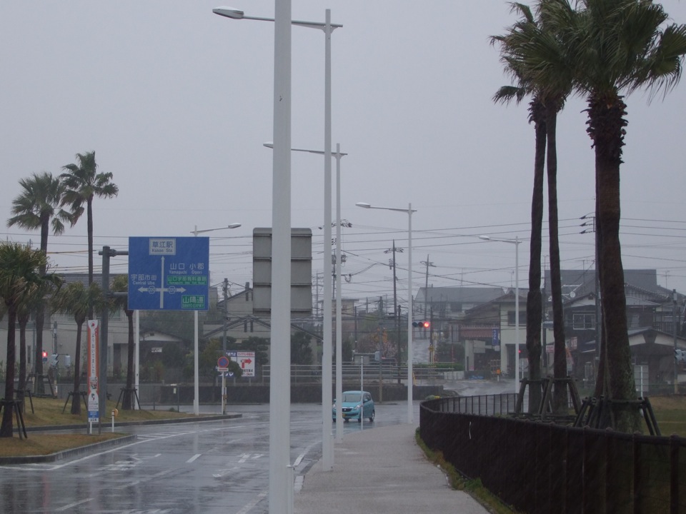 そこが、今回の鉄道の旅のスタート地点というのも愉快ですが、前々から自分はこの駅を空港経由で利用してみたかったのです。先程言ったように、この日の西日本地区の天気は雨で、空港からの道のりも、スーツケースを引きずりつつ、雨に濡れながらの(特に屋根付きの道で結ばれているわけではないので…)ものになってしまいましたが(笑)、なかなか面白い体験が出来ました。乗る予定の草江駅発の列車は8:51発。時間的にはもちろん余裕で、ここから新山口駅までは約40分の旅となります。