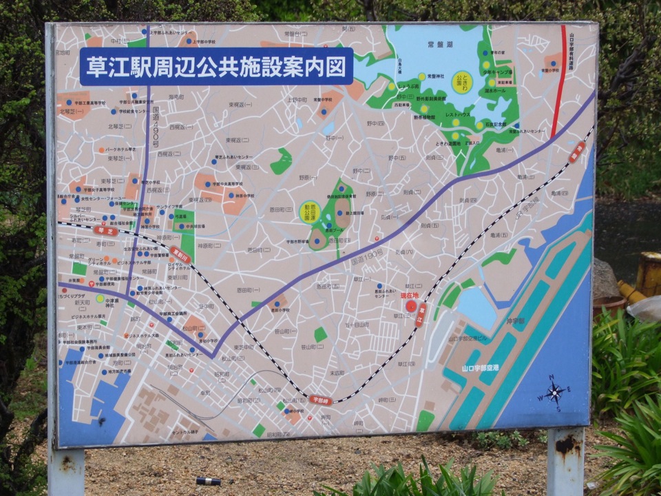 …では、自分もここからの移動はバス…かと思いきや、実は鉄道でも移動できる方法が存在しています。…とは言え、鉄道に“山口宇部空港駅”となる駅はなく、空港ターミナル付近を見渡しても、鉄道が乗り入れているような感じはなさそうな気がします。しかし、この空港の近くにはJR西日本の宇部線というローカル線が走っており、空港から600メートルくらいの位置に、草江という駅が存在していて、これは空港ターミナルから歩いても行ける距離にあるのです。