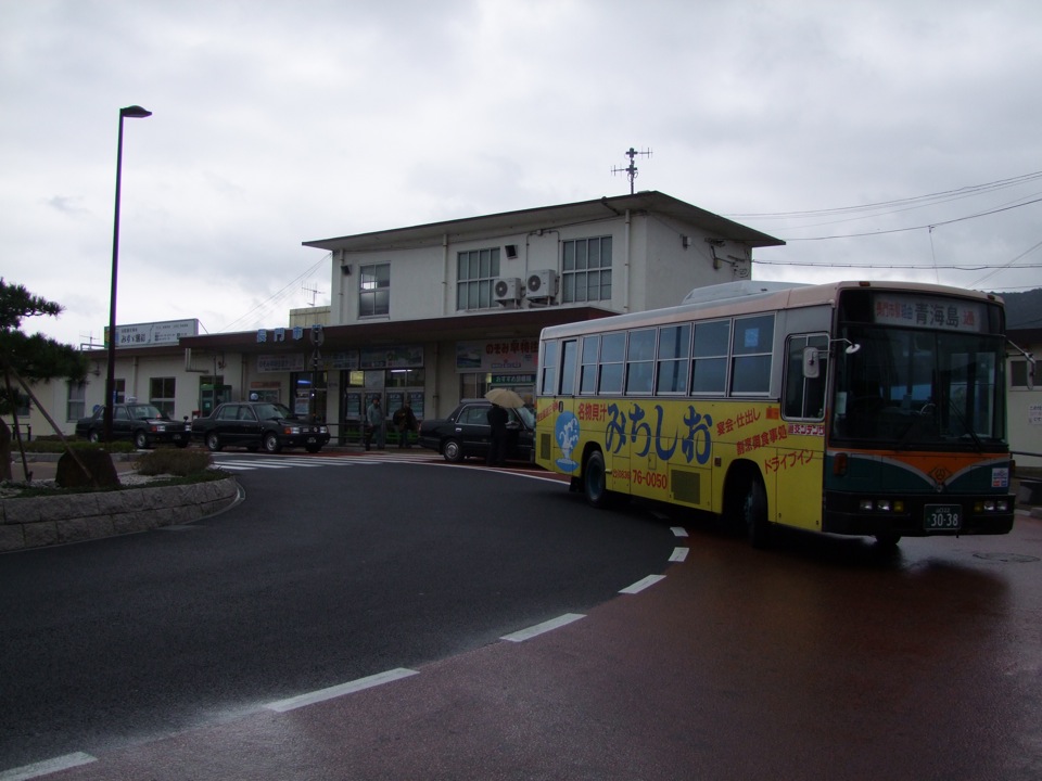 長門市駅発、仙崎行きの列車は15:56発。3分で終点仙崎駅に着き、それが折り返して、仙崎駅16:07発、長門市駅経由の美祢線厚狭駅行きとなるのですが、それだと仙崎駅には8分しかいられない計算になってしまいます。別に仕方の無い事だとは思いますが、とりあえず長門市駅で時間潰しの為、駅舎でも写真に撮りながら待っていると、ふと路線バスが目の前に停まり、経由地に“仙崎駅”と書かれているではありませんか。…成程、これは思い立ったが吉日です。運転手に仙崎駅を通る事を確認しつつ、そのままそのバスに揺られる人となりました(笑)。長門の街を抜け、ちょっとした海沿いを走るルートはなかなか面白く、バスならではの風景が楽しめましたが、約7~8分くらいで仙崎駅前に着いてしまいました。この時点で時刻は15:40頃…。とりあえず、これならゆっくりと仙崎駅を眺められるというものです。