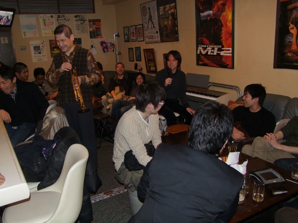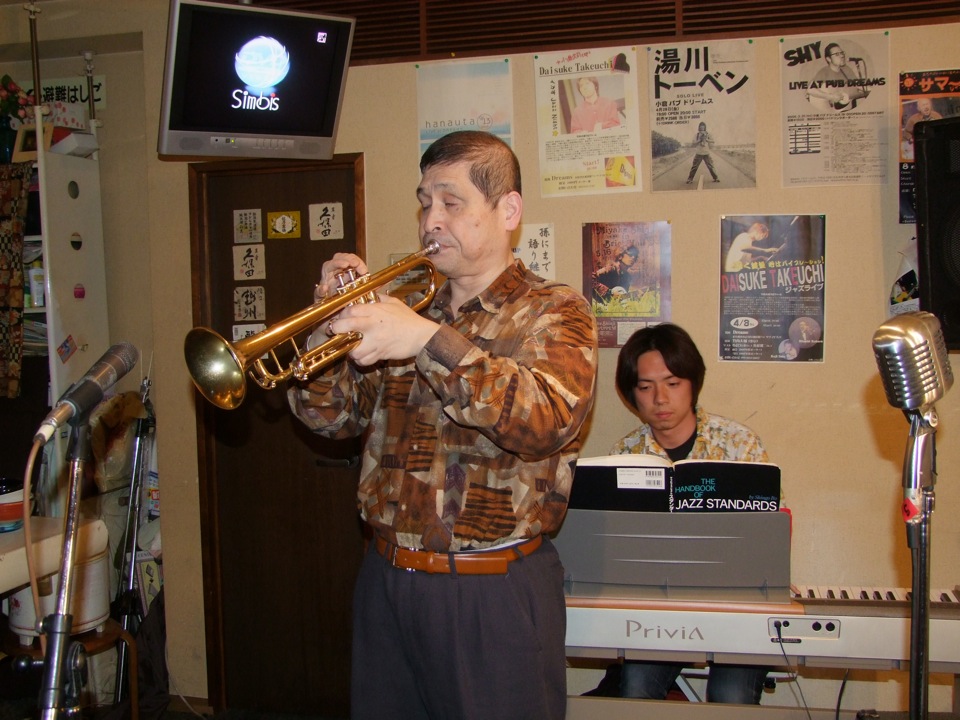 …そして、何となくこのまま帰るのもあれ(笑)だったので、昨日の Dreams に再度足を運ばせました。もう馴染みな感じなので、特に何の言付けも無く寄った感じでしたが、この日はお客さんが大勢いて(学生さん達でしょうか?)、せっかくなので2、3曲弾いてって言われてしまいます…。しかも、昨日のトランペットの小倉さんも駆け付けて頂いて、昨日に引き続いての?ジョイント・ライブが幕を開けてしまいました!
