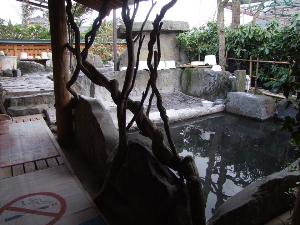 そこは“万年の湯”という場所で、特に山奥にあるような感じではなく、ある意味?市街地の中にポツンと佇んでいる感じでした。番頭さんがいるわけでもないようで、入口にお金を入れる所があって、そこに半ば自己申告的に(笑)100円を入れるだけでした。中に入ってみると確かに露天で、2つのお風呂があり、これで100円は確かに安いです。写真は男性用ですが(当たり前です…笑)。女性用は一応建物に包まれているので、これはこれで問題は無いでしょう…。もちろん設備的には何もありませんが、かえってそれが情緒的なムードを漂わせてて良いかなとも思いました。思う存分寛げました♪