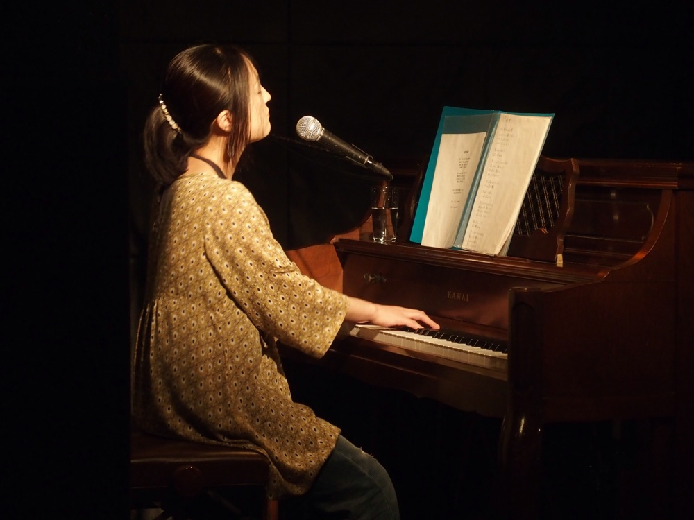 そしてトップバッターは、ピアノ弾き語りの斎藤奏江さん。ピアノに乗せた歌声は心地良く、すぐにステージに引き込まれてしまいます。ピアノに関しても、1音1音に拘りを見せた伴奏を弾いており、常に自分の曲に対しての向上心が窺えたものでした。また、この日の特徴として、全ての出演アーティストと鹿嶋さん自身のコラボが行われたのですが(右上写真参照)、こちらもまた素晴らしいものでした。1人1人の力が、3倍、4倍にもなったと言いますか、シンプルながら、この日の期待感を煽るような、そんな時間になっていたと思います。
