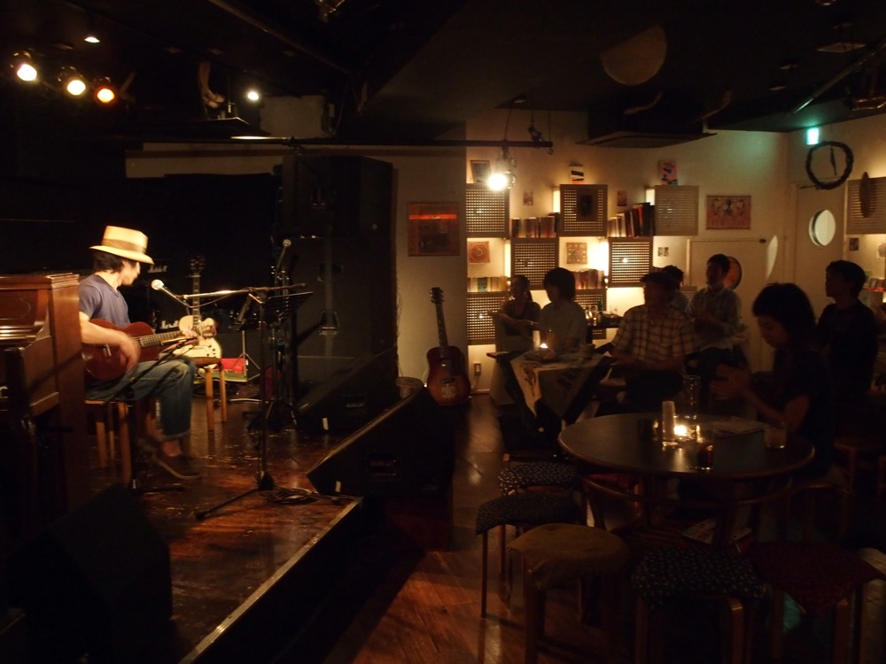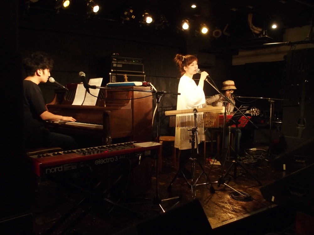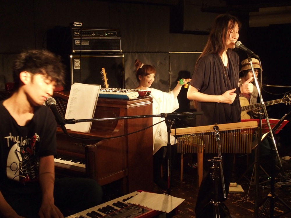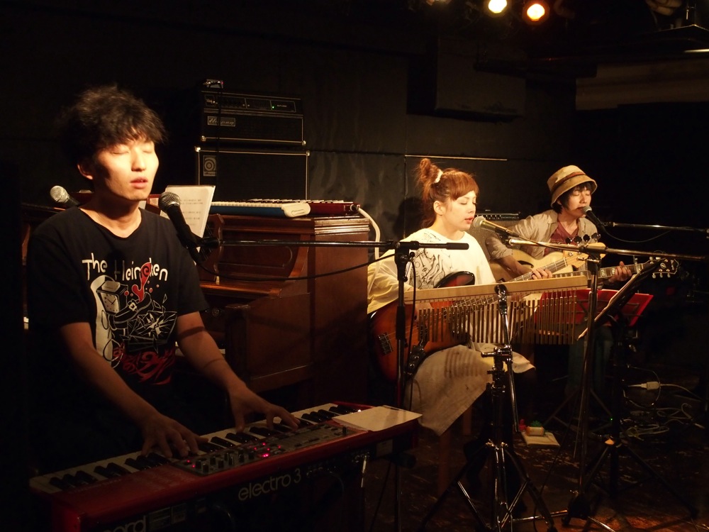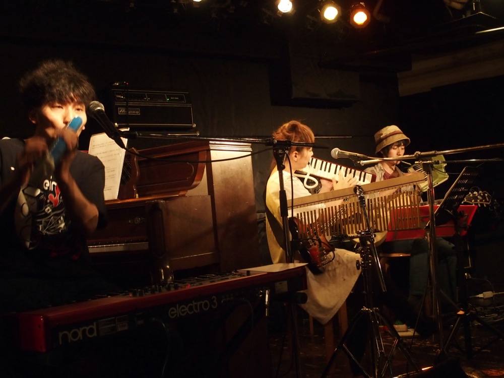 2バンド目には、前述の水井君率いる“亀ト魚ト金魚”という3人組ユニットの登場です。このメンバーは、全員それぞれが楽器を弾き、更にコーラスを含めたボーカルをとれるという、正にシンガーソングライターが3人集まったようなユニットで、個性的な3人が集まったら、こんな音楽が作れる!…というのをそのまま具現化したようなユニットでした。その中でも、メインのボーカルをとる金魚担当?の女性の方がベースを弾いていたのは驚きましたが(普段の音楽活動でも、ベースを弾きながら歌っているそうです)、たまにウインドチャイム等のパーカッション系も演奏する等、その幅の広さもまたサウンドに深みを出していました。