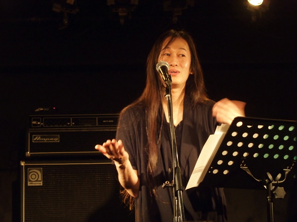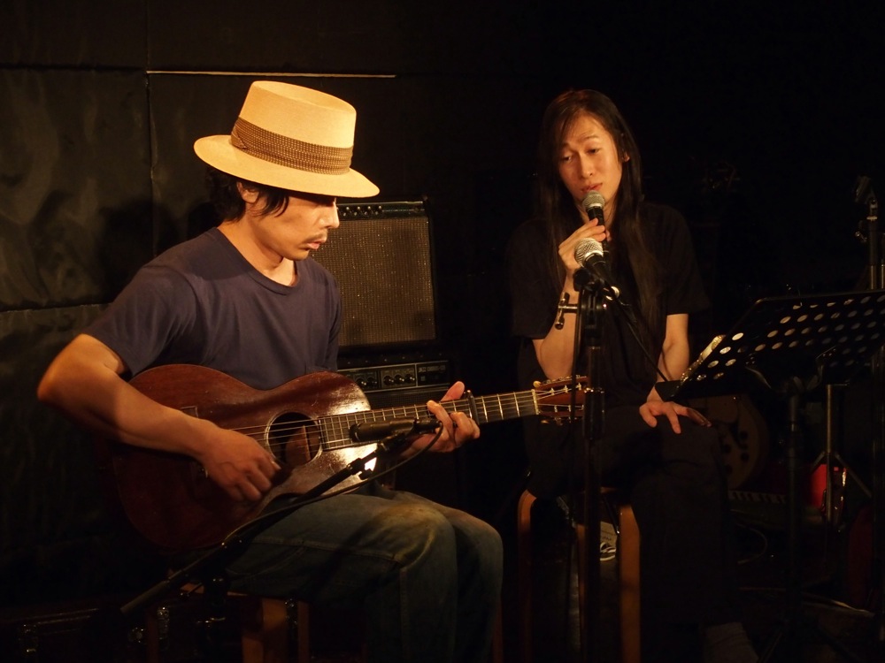…今度は打って変わって、ギター弾き語りの梅原典之さんの登場です。ギター1本でステージに立ち向かう姿は正に男らしく、オリジナルの曲もそんな雰囲気が満々という感じでした。それまでの出演者も個性的ではあったのですが、ここで一気に流れを変えてしまう程、またこちらも極上の個性の持ち主だったと言えるでしょう。ここでの鹿嶋さんのコラボは、初めて座って歌うという手法をとっていましたが(右上写真参照)、これがまたこの時の世界観に合っていた感じでもあり、流石だと思いました。流石 Serious Playground、真剣の遊び場…です。