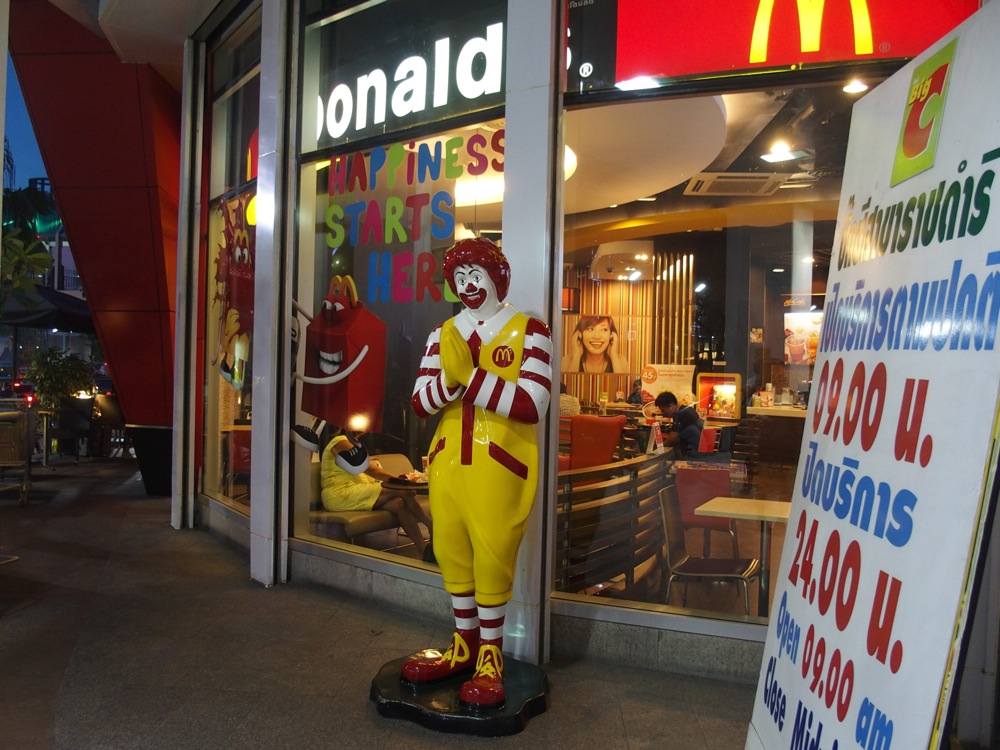 そんなバタバタした2日目に比べ、3日目と4日目はバンコク市内に留まりつつ、色々な場所へと足を運ばせていきました。今回、バンコクは2度目の訪問で、12年振りというタイミングでもあったのですが、やはり昔に比べると高層ビルが増え、より近代的な街になったような印象がありました。しかし、相変わらず道路の渋滞は甚だしいですし、相変わらずタクシーの運転手はすぐにボッてきますし(笑)、屋台の乱雑さも健在でしたし…、やはりバンコクらしさはまだまだ残っていて楽しかったです。ドナルドはワイのポーズでお客さんを出迎えていました。