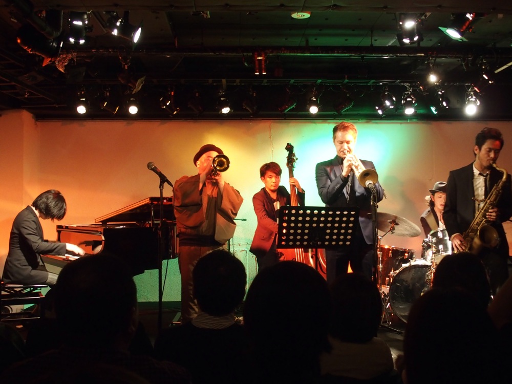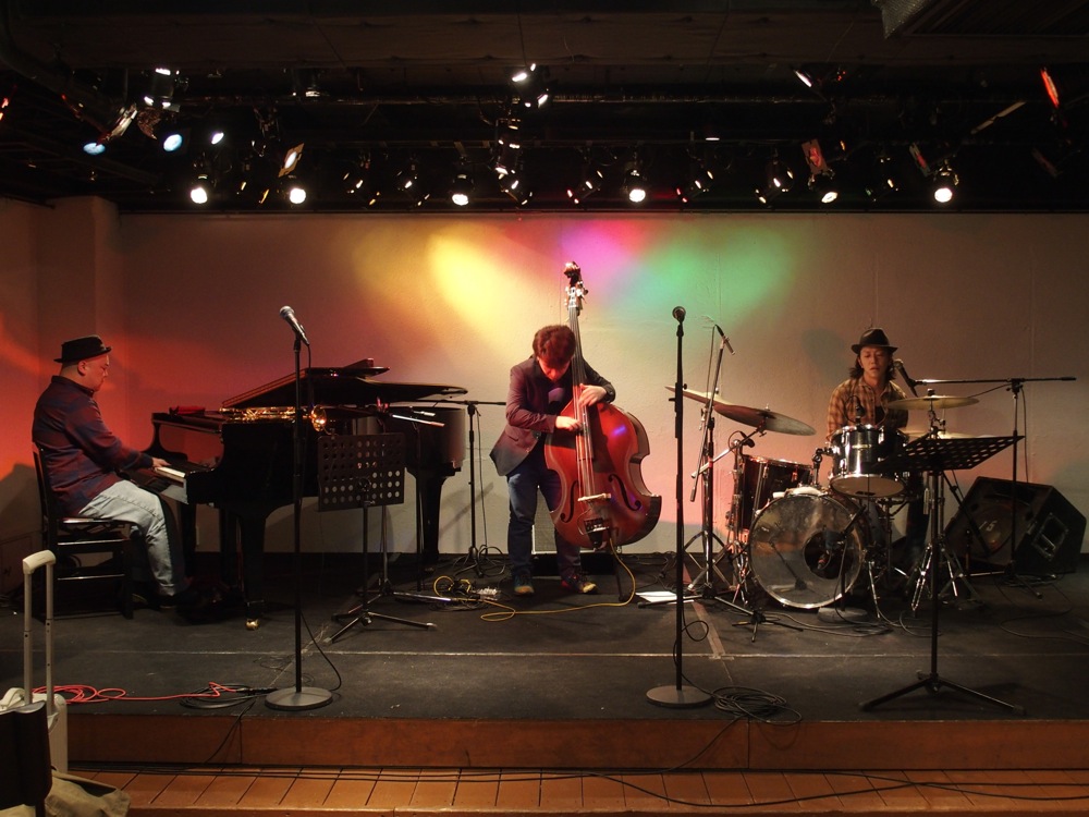 そして、今度は Five CornersQuintet の曲から“Shake It”を演奏しました。この曲は今回初めて演奏した曲でしたが、何とも耳に残る雰囲気を持った曲で、この曲を一緒に演奏出来るというのも、有り難いと思わなくてはならないですよね…。そのまま今度は、トランペットの織田君と Jukka でフリーの掛け合いが始まり、自分達でアレンジをした“Moanin'”へと突入させます。ここでの曲のテーマを1フレーズずつ、2人で分け合って弾くというのは Jukka のアイデアで、緊張感の掛け合いから、緩和の掛け合いへと見せ方が変わり、とても引き込まれる構成になっていたのではないかと思います。勿論、ソロの研ぎ澄まされたフレーズも凄いの一言です!