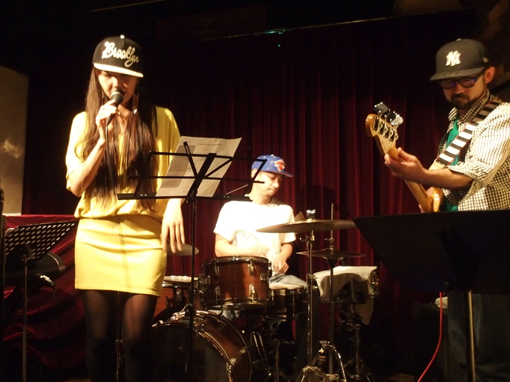 それは、出演メンバー全員でキャップを被ってステージに上がり(右上写真参照)…ではなく(間違いでは無いですが…笑)、アナログシンセを使ってステージに臨んだ事でした。アナログシンセサイザーは、左上写真の右上に写っているキーボードですが、トシさんにこれをお借りしまして、既存のエレピと併用して演奏していったのでした。