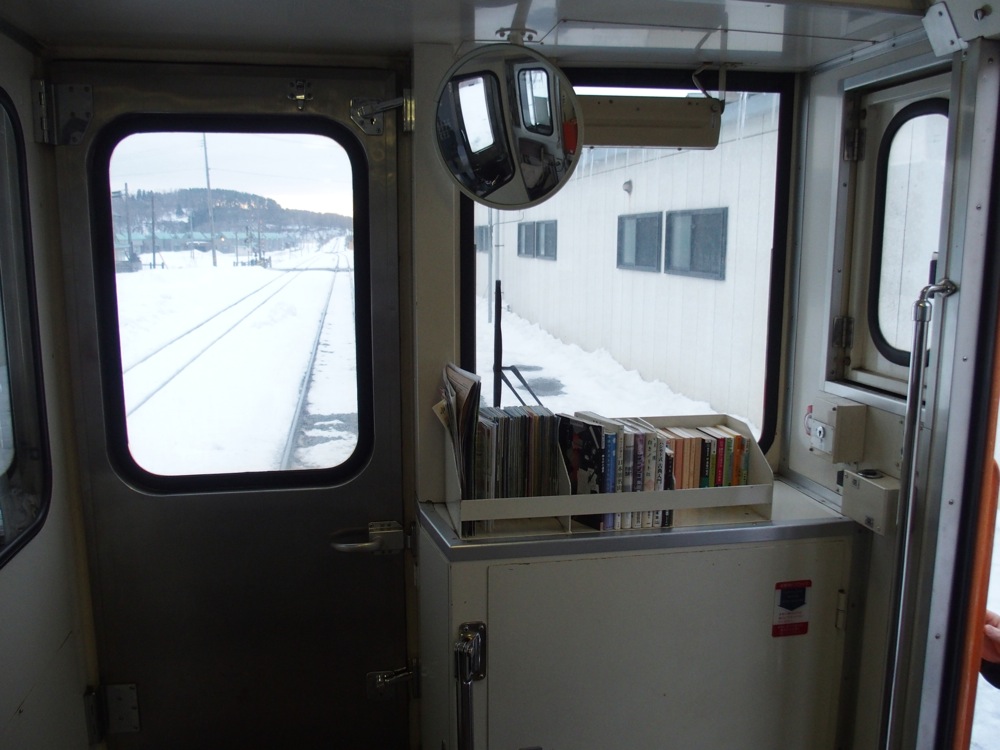 …という事で、早速今来た鉄路を戻ります(笑)。先程の車内とは一転して、学生ばかりが目立つ状態となっており、だいぶ活気のある車内になってきました。ボックス席は全て占領されてしまったので、運転席の横に場所を陣取ると、正面の窓付近に文庫本が何冊か置かれているではありませんか。御自由にどうぞ…との事でしたが、確かにここは太宰治出身の地でもあり、車両には『走れメロス号』の愛称も付けられています。文学作品に気軽に触れられるように…という配慮なのかもしれません。ちなみに、これらの文庫本は主要駅の待合室にも置いてあり、家に持ち帰って読んでも良く、読み終わったら元の場所に戻しておいて下さい…との事。中には著者のサインまでもが書かれた本もあり、時間があったら利用したいシステムではありますよね。