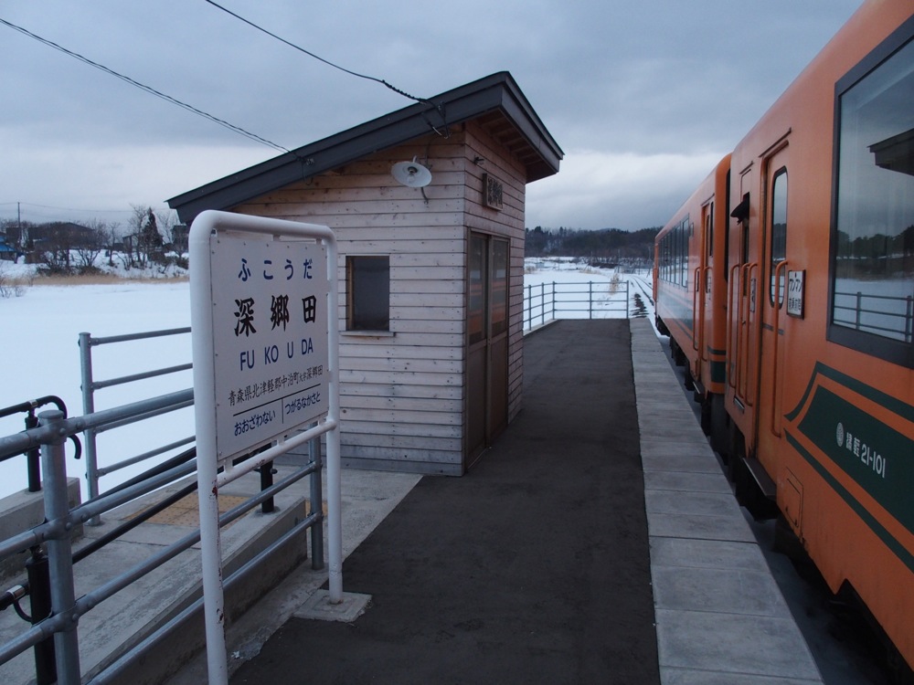 さて、1駅進んで、深郷田という駅で降ります。「ふこうだ」…と読む、変わった駅名なのですが、ここから更に1駅先の大沢内駅まで“さんぽ”してみましょう。まだ時刻は朝の7:20ぐらいであり、こんなに朝早くから駅を降りて“さんぽ”するのも珍しいのですが(笑)、津軽半島らしい荒涼とした雪景色と、活気ある列車内の雰囲気とは対照的な静かな街並みを歩くのは、東京に住んでいては滅多に体験出来ない事でもあるので楽しいです。まあ、この駅間では国道が津軽鉄道をオーバークロスする区間があり、そこからの撮影がメインではあるのですが…(笑)。