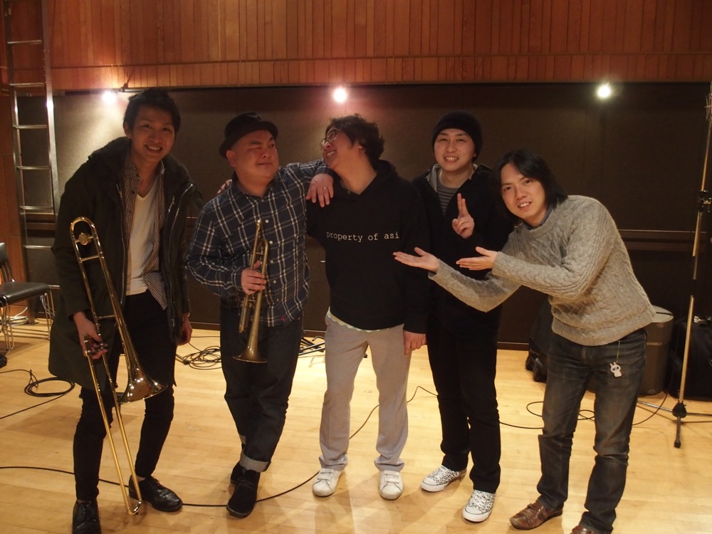 そんな今回は、珍しいメンバーで演奏したのも特徴の1つかと思われます。織田君と自分以外では、ベースにカワイヒデヒロ君、ドラムに今村慎太郎君、そしてトロンボーンに、昨年の夏に TRI4TH と共演させて貰った、Star Bell Plus の馬場佑介君という面々でした。自分にとっては久し振りに共演したメンバーもいつつ、勿論この5人で音を出した事は今までに無かったので、とても新鮮な気持ちでレコーディングに臨めたように思います。そして、至って順調に進める事が出来ました♪